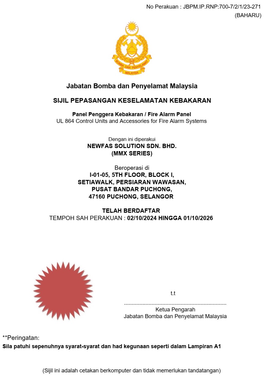 NEWFAS SOLUTION was established in 2022, a young and full of energetic company and founded by the team who are very passionate and profession in fire safety industry. We are specialist in design, project implementation, technical support and site services including testing and commissioning fire alarm system, fireman intercom, explosion proof devices, etc. We able to support our customers and projects owner to provide the best fire alarm solutions with taking consideration product quality, project requirement and budget. Our team are well train and technical certified by manufacturer. We are committed to provide consistent products service to all our customer and instill values through long term customer relationship by helping them to gain profitability and grow together.
